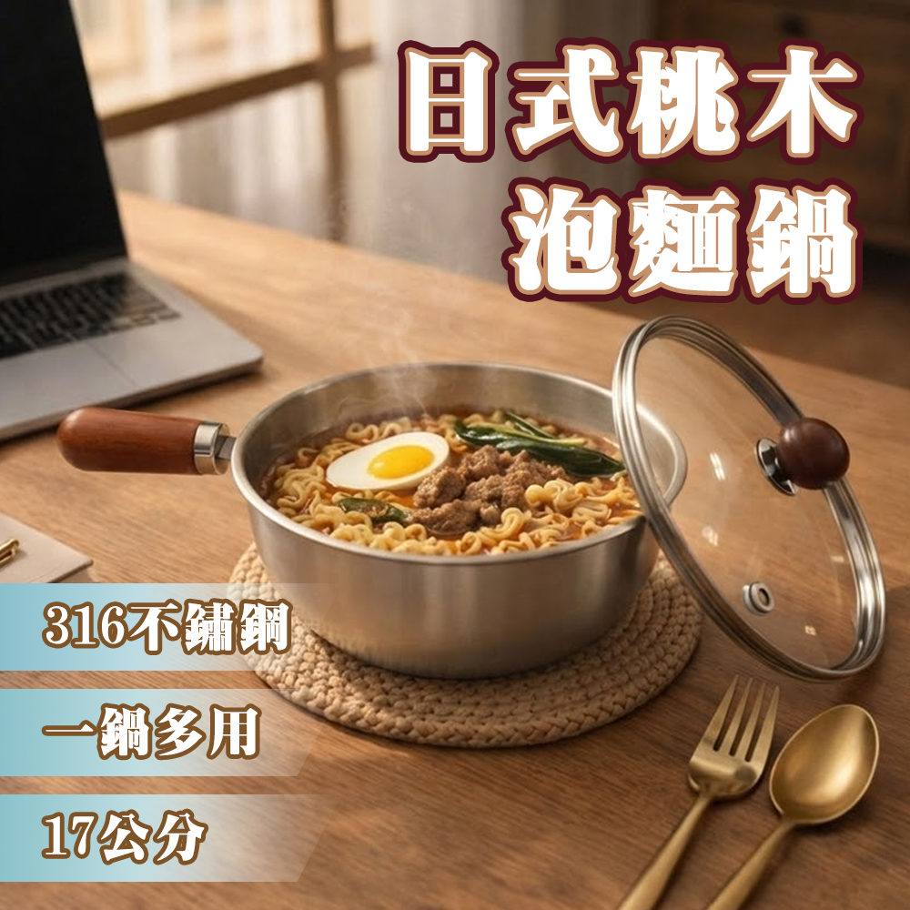 日式桃木316不鏽鋼泡麵鍋【帶蓋】17cm