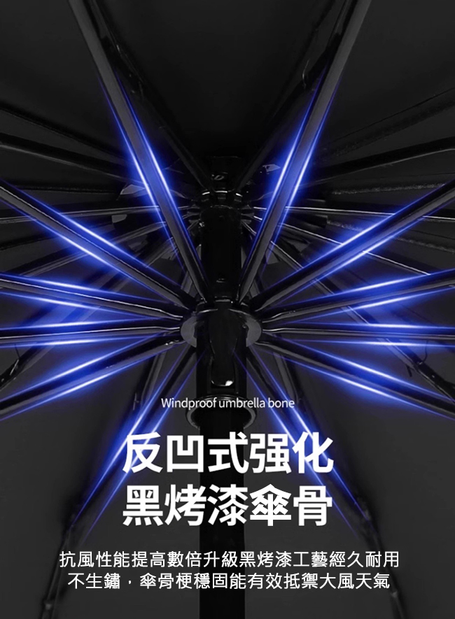 ◆反凹式強化,黑烤漆傘骨,經久耐用不生鏽