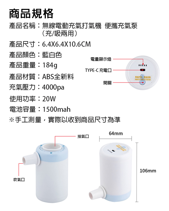 產品名稱:無線電動充氣打氣機/抽真空/ 便攜充氣泵(充/吸兩用)(S0016)