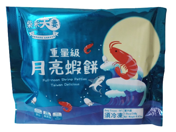 產品名稱:柴米夫妻重量級月亮蝦餅成份:魚漿(鯊魚肉、水、樹薯粉)、蝦仁、花枝、糖、潤餅皮(麵粉、水、鹽)、鹽、香油(芝麻油、大豆油)、白胡椒淨重:約240g/片保存方式:請置於-18°C冷凍保存期限:12個月(未開封)有效日期:如包裝標示食品添加物名稱:無原產地:台灣