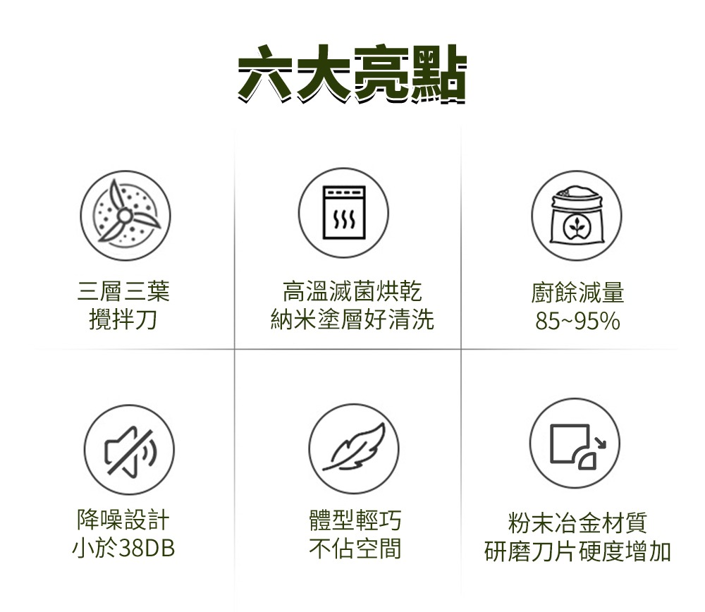 奈米陶瓷塗層容易清理除臭研磨烘乾,濕垃圾變有機肥料三層三葉攪拌刀高溫烘乾研磨除臭環保活性碳盒高溫滅菌烘乾 納米塗層好清洗廚餘減量85~95%降躁設計 小於38DB體型輕巧 不佔空間