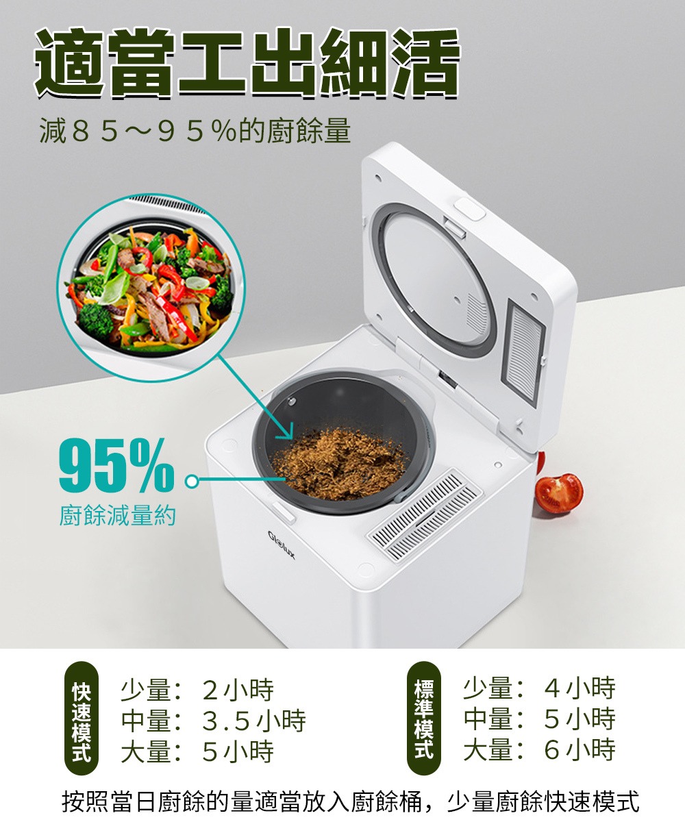 規格:‧容量:2.5L‧噪音:小於38〜40dB‧廚餘減量率:85-95%‧工作時間:快速模式2-4小時;標準模式4~6小時(視廚餘量情況有不同的工作時間)‧主要材質:ABS、PC、鋁合金‧鍋體塗層:粉末冶金+奈米陶瓷塗層‧產品重量:5.5kg‧產品尺寸:23x23x27cm‧配件:廚餘桶*1、碳盒*1、除臭活性碳*1包、說明書‧保固期:主機保固一年/ 配件不保固 https://youtu.be/J3OY4cAiIec