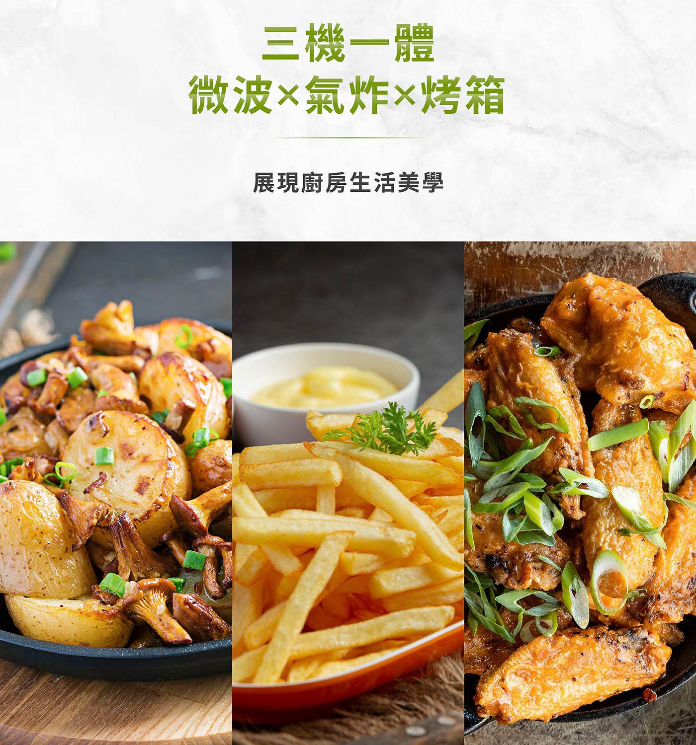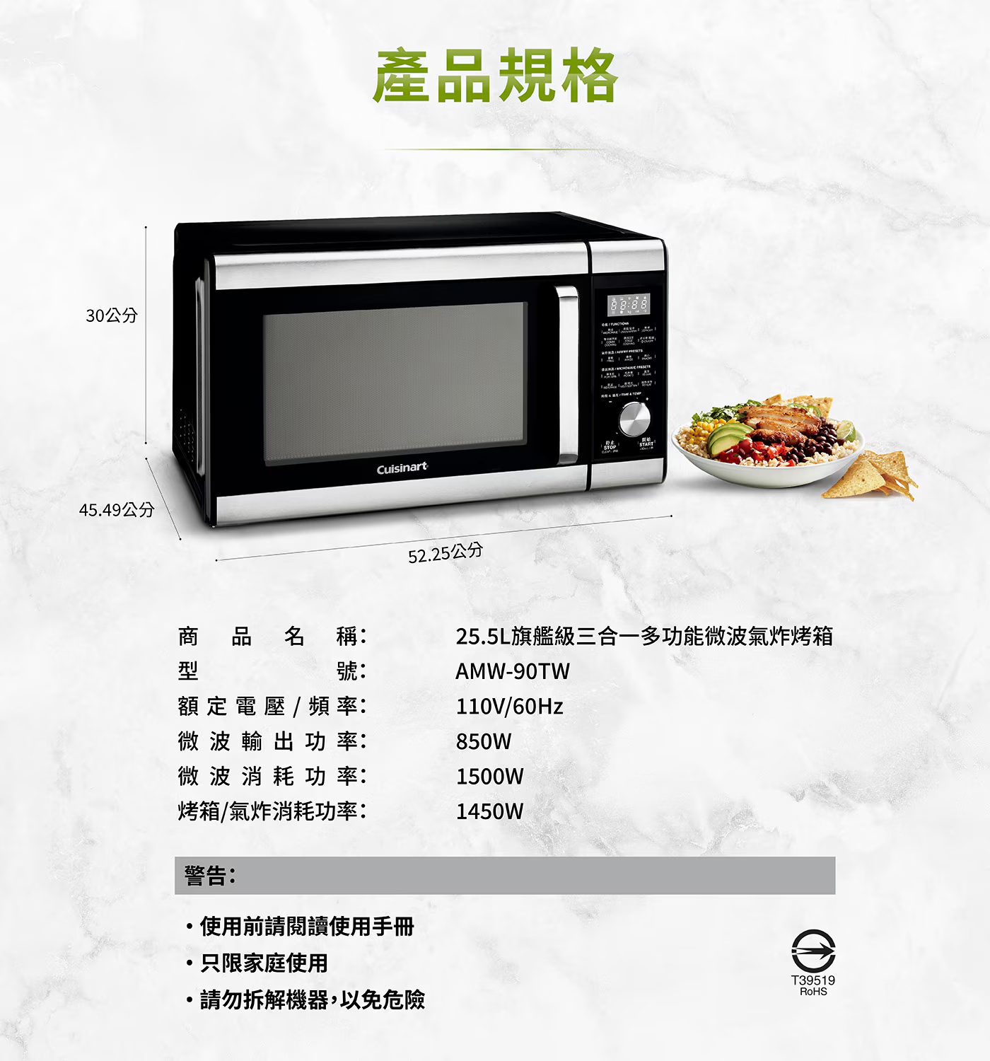 品名 : 美膳雅 三合一微波氣炸烤箱 AMW-90型號 : AMW-90TW商品容量 : 約 25.5公升商品重量 : 約 15.4公斤商品尺寸 : 長 52.2公分 X 寬 45.5公分 X 高 30公分電壓/頻率 : 110V / 60Hz消耗功率 :微波1500W烤箱或氣炸1450W內容物 : 主機、微波轉盤、烤盤、氣炸籃、說明書、原廠彩盒保固期限 : 兩年產地 : 中國