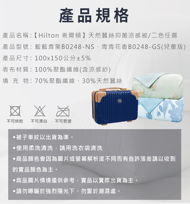 產品名稱:【Hilton 希爾頓】天然蠶絲抑菌涼感被/二色任選