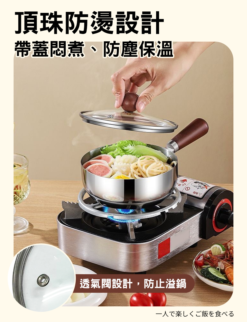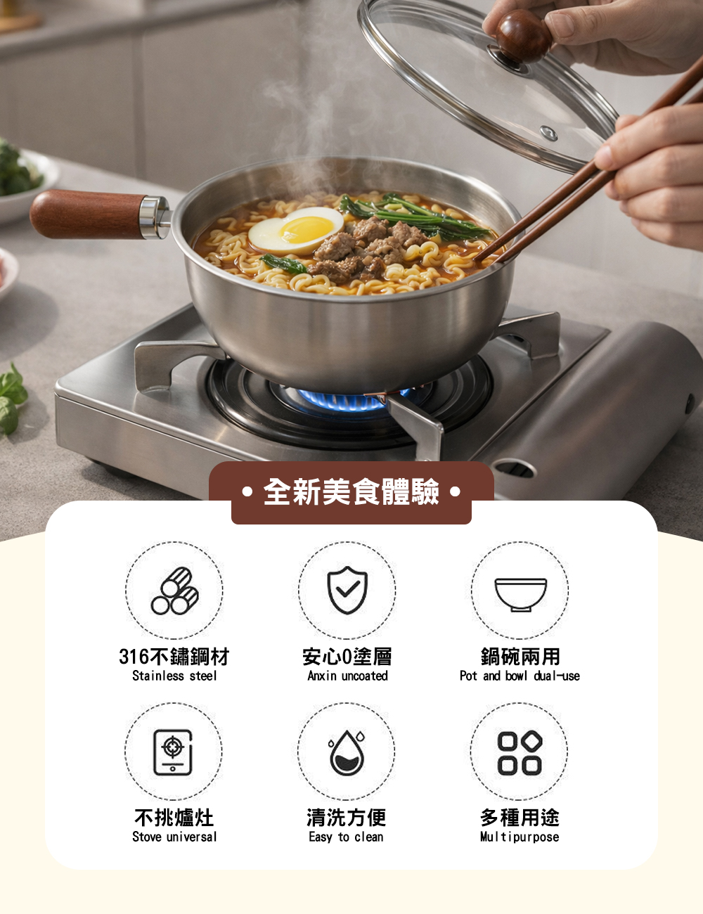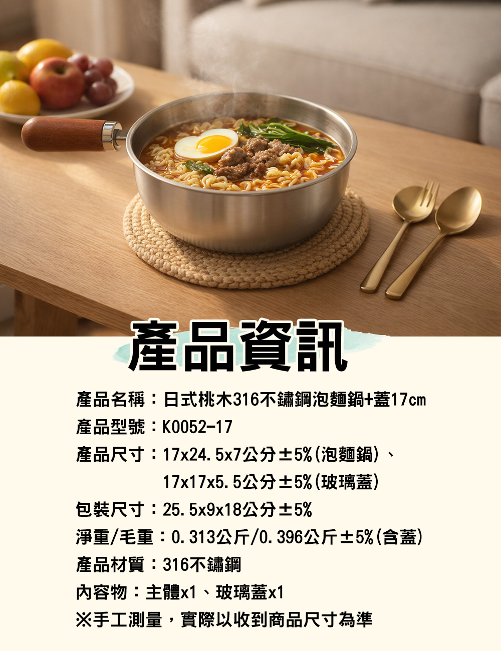產品名稱:日式桃木316不鏽鋼泡麵鍋【帶蓋】17cm