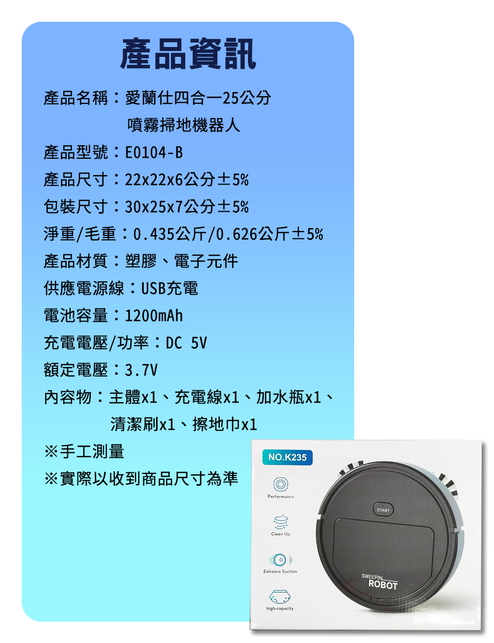 產品名稱:【愛蘭仕】四合一25公分噴霧掃地機器人