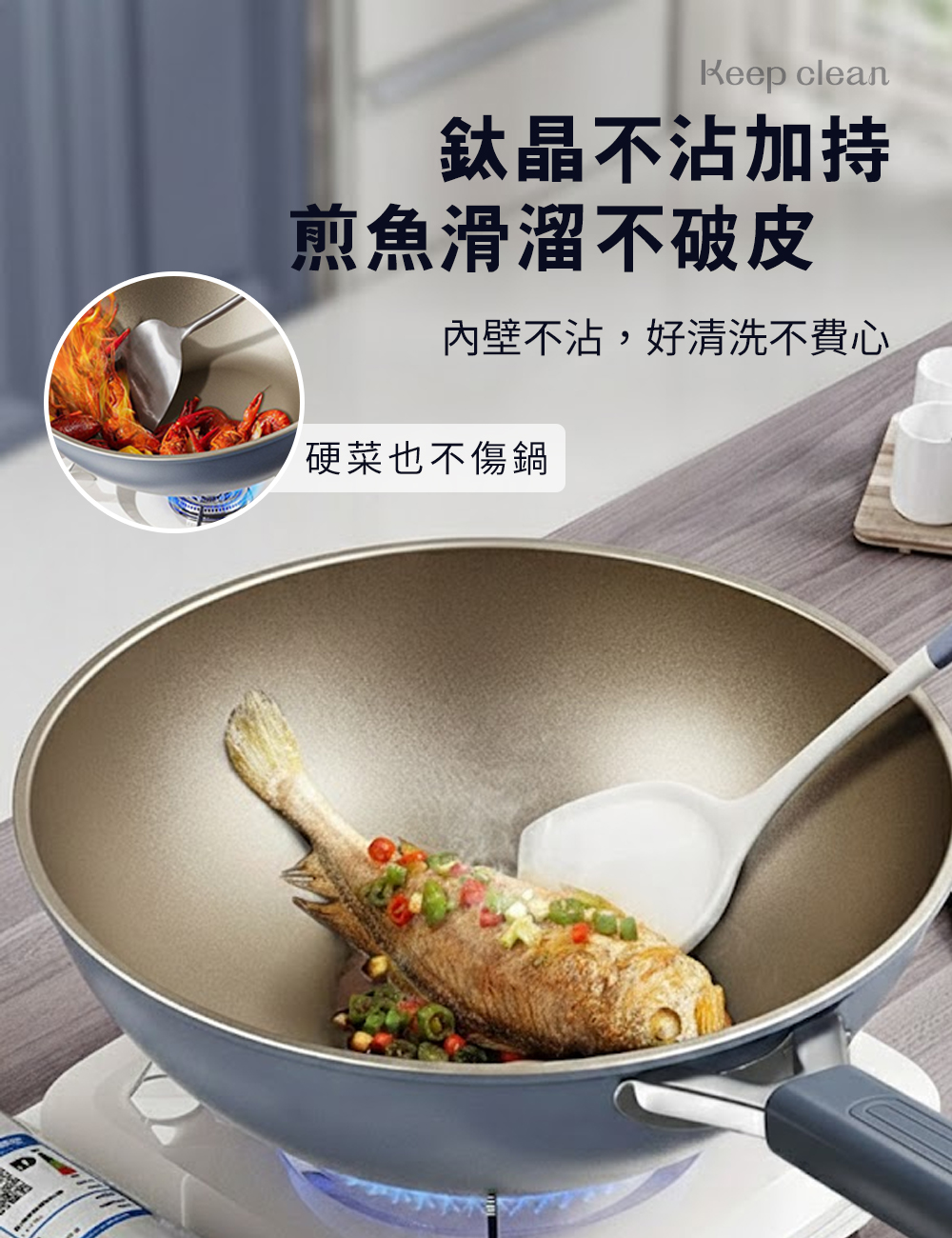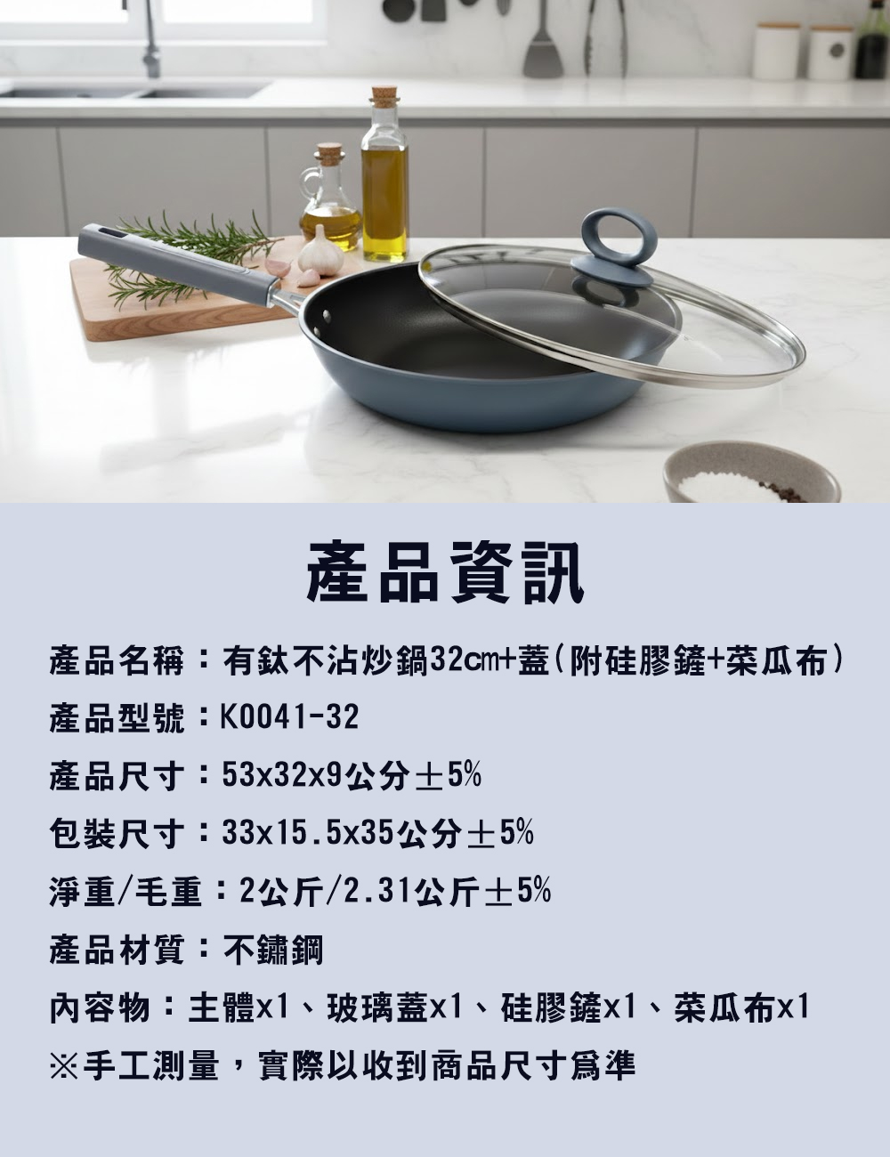 產品名稱:有鈦不沾炒鍋32cm+蓋(附硅膠鏟+菜瓜布)