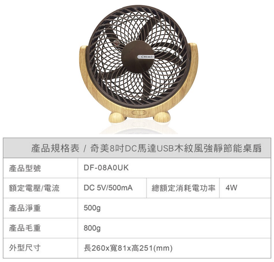 【高雁團隊】【奇美 (全新福利品)】8吋5片式木紋風USB DC節能循環扇