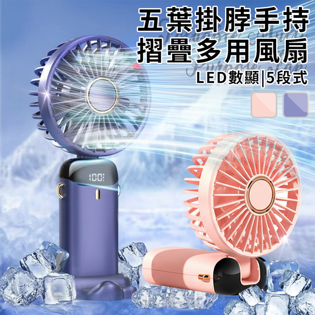 【買一送一】香氛USB充電式LED數顯5段式五葉掛脖手持摺疊多用風扇 (二色任選) 共2支