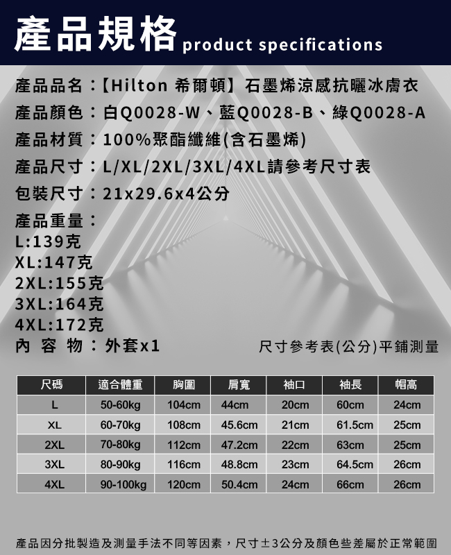 產品品名:【Hilton 希爾頓】石墨烯涼感抗曬冰膚衣/3色顏色:淺灰 天藍 白色尺寸:L XL 2XL 3XL 4XL商品尺寸:請參考尺寸表包裝尺寸:21x6x29.6公分x4公分±5%淨重/毛重:1.39~1.72克±5%產品材質:聚酯纖維(含石墨烯)內容物:外套x1※手工測量,數值為參考,實際以收到商品尺寸為準※希爾頓寢具品牌之商品與希爾頓飯店無關,特此聲明