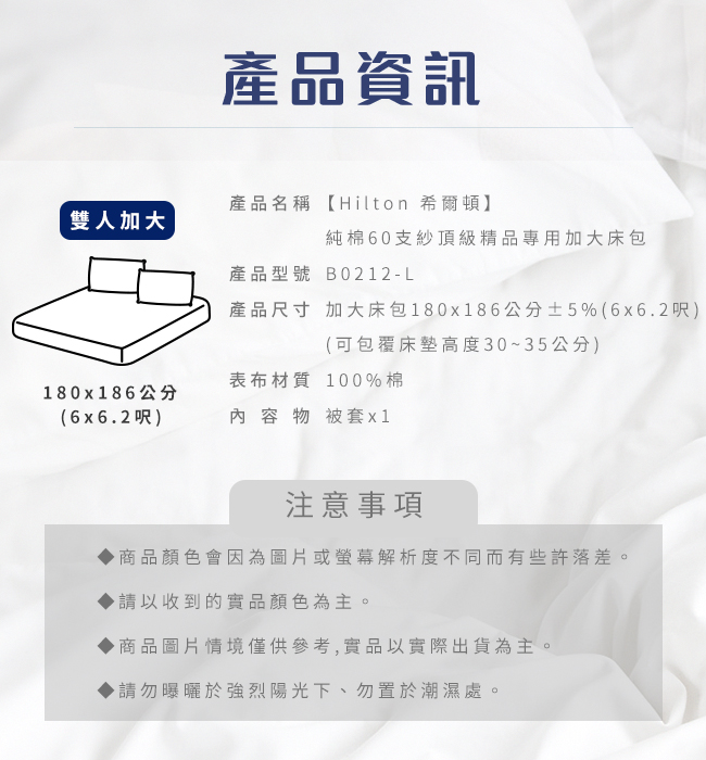 產品尺寸:加大床包180x186公分±5%(6x6.2呎)(可包覆床墊高度30~35公分)