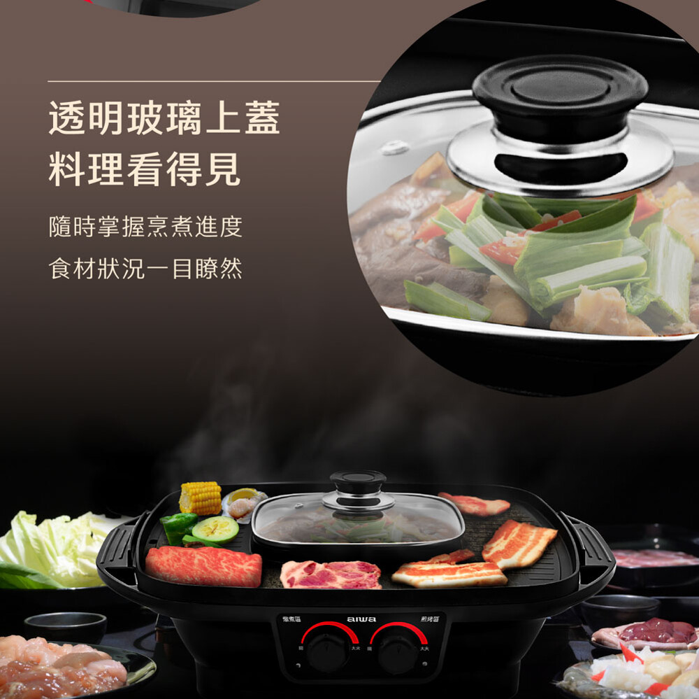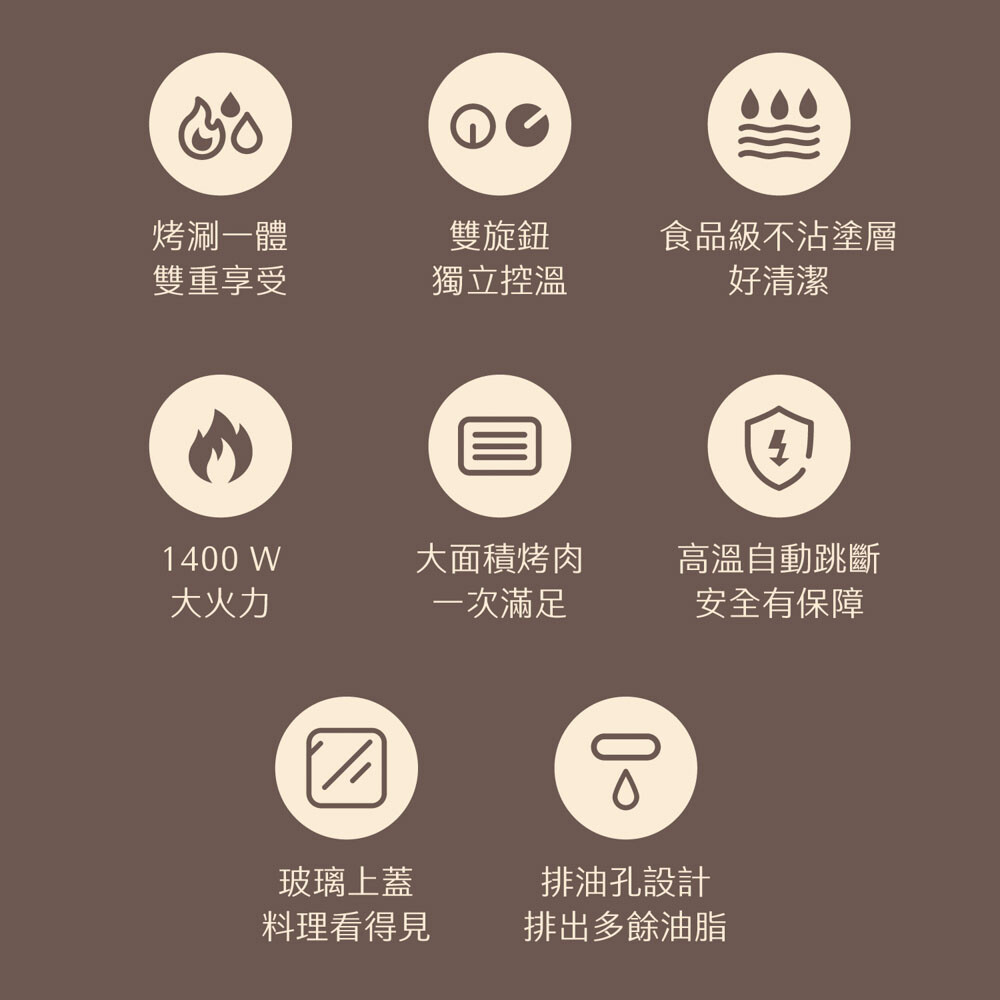 1400瓦大火力大面積烤肉,一次滿足溫度保險絲,高溫自動跳斷,安全有保障玻璃上蓋,料理一目了然