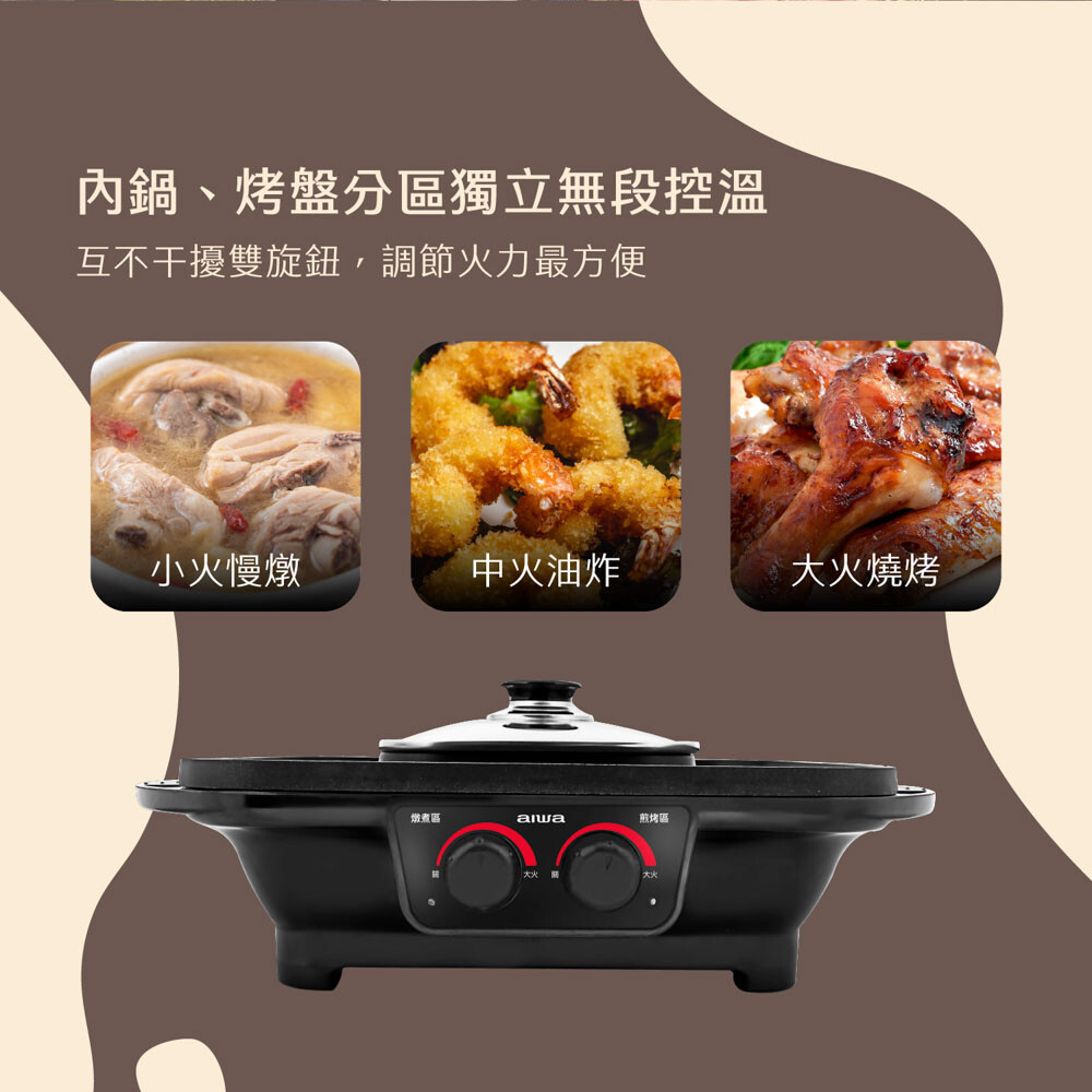 品牌:AIWA品名:多功能料理盤型號:AI-GEH3商品尺寸:500*420*130mm彩盒尺寸:570*470*170mm商品重量:約2.8kg包裝重量:約3.5kg主機電源:110V/60Hz總額定消耗電功率:1400W商品原產地:中國BSMI:R38456 / CI381064560590配件:電源線*1 / 保證書*1 / 說明書*1 / 鍋蓋*1