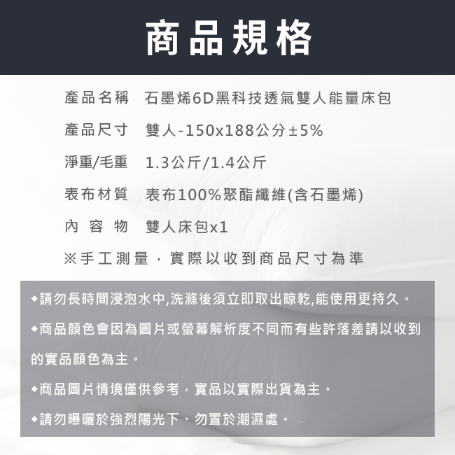產品名稱:石墨烯6D黑科技透氣雙人能量床包