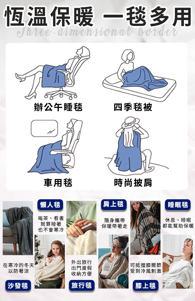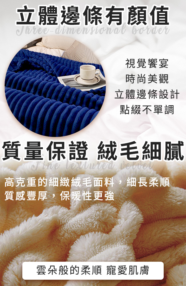 ◆立體邊條高品質質量,鬆軟柔感細緻親膚,一毯多用途