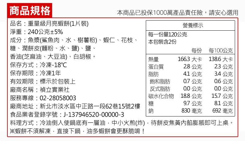 產品名稱:柴米夫妻重量級月亮蝦餅成份:魚漿(鯊魚肉、水、樹薯粉)、蝦仁、花枝、糖、潤餅皮(麵粉、水、鹽)、鹽、香油(芝麻油、大豆油)、白胡椒淨重:約240g/片保存方式:請置於-18°C冷凍保存期限:12個月(未開封)有效日期:如包裝標示食品添加物名稱:無原產地:台灣