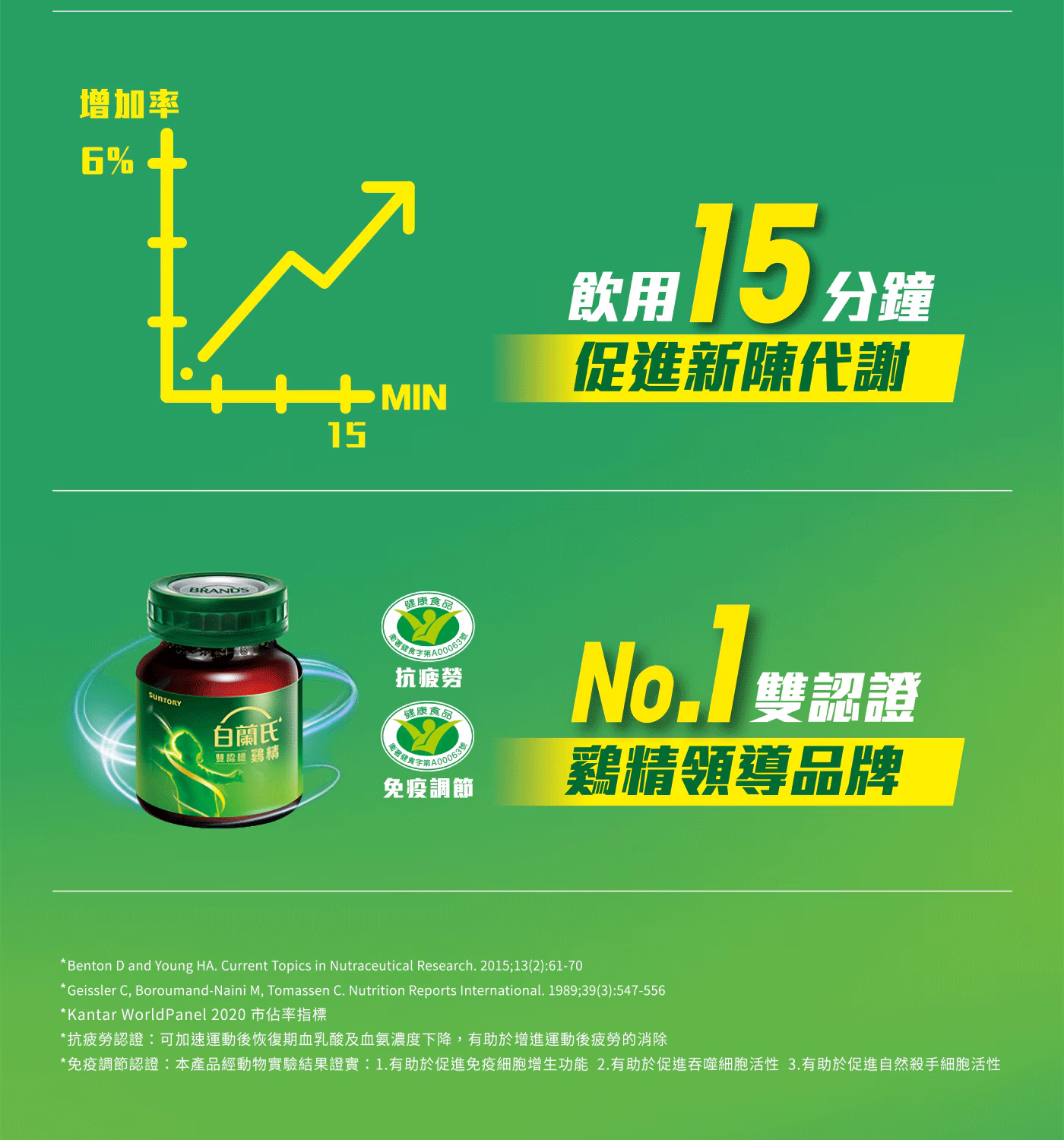 1.抗疲勞認證:可加速運動後恢復期血乳酸及血氨濃度下降,有助於增進運動後疲勞的消除。