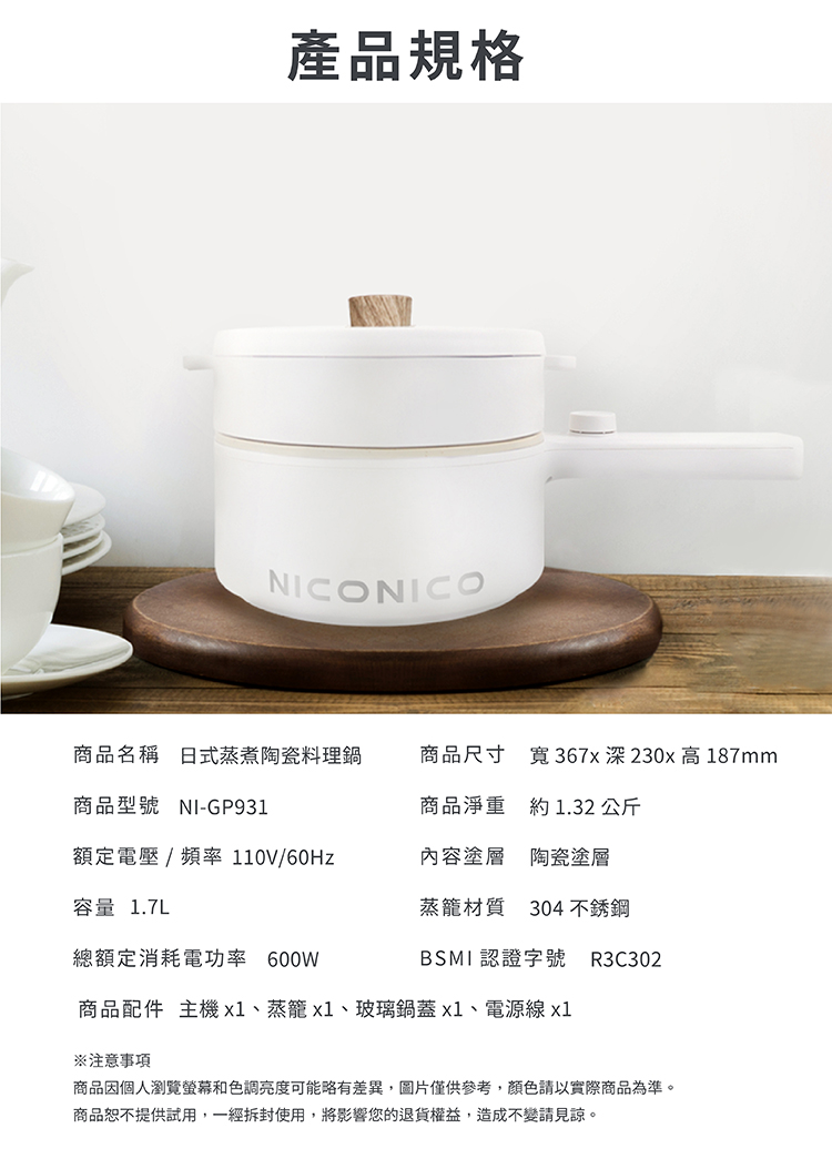 •配件:主機x1、蒸籠x1、玻璃鍋蓋x1、電源線x1、說明書x1、保固書x1