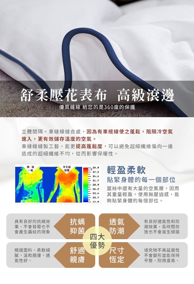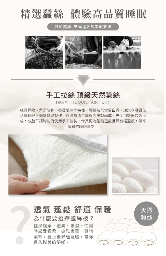 天然嚴選蠶絲,防霉防蹣,輕盈保暖