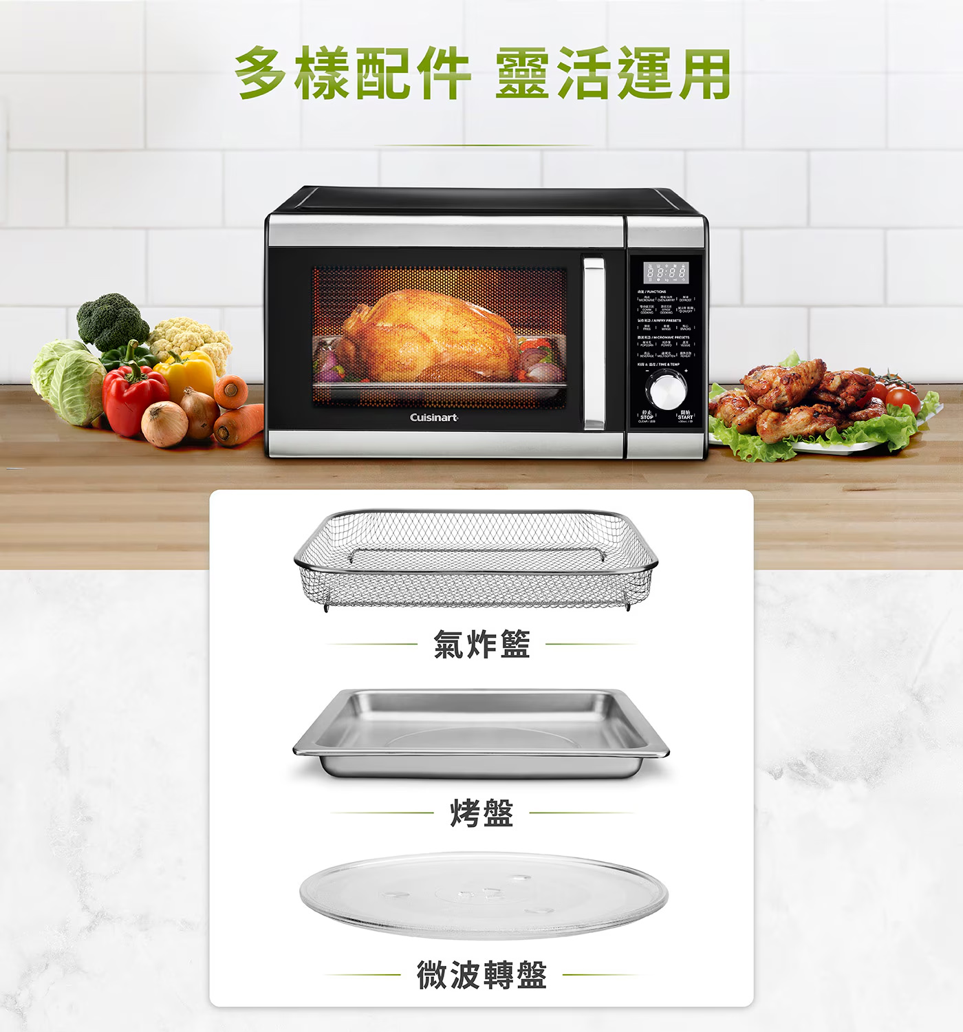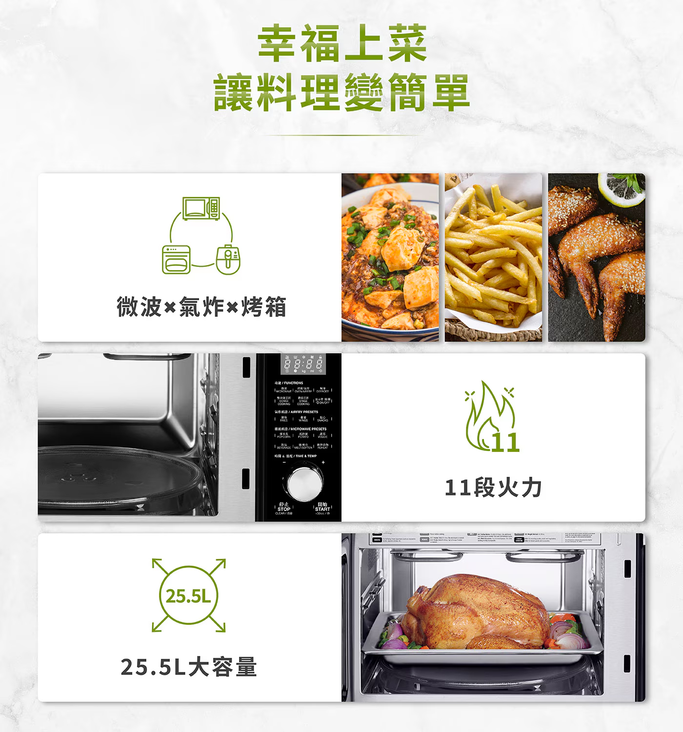 品名 : 美膳雅 三合一微波氣炸烤箱 AMW-90型號 : AMW-90TW商品容量 : 約 25.5公升商品重量 : 約 15.4公斤商品尺寸 : 長 52.2公分 X 寬 45.5公分 X 高 30公分電壓/頻率 : 110V / 60Hz消耗功率 :微波1500W烤箱或氣炸1450W內容物 : 主機、微波轉盤、烤盤、氣炸籃、說明書、原廠彩盒保固期限 : 兩年產地 : 中國