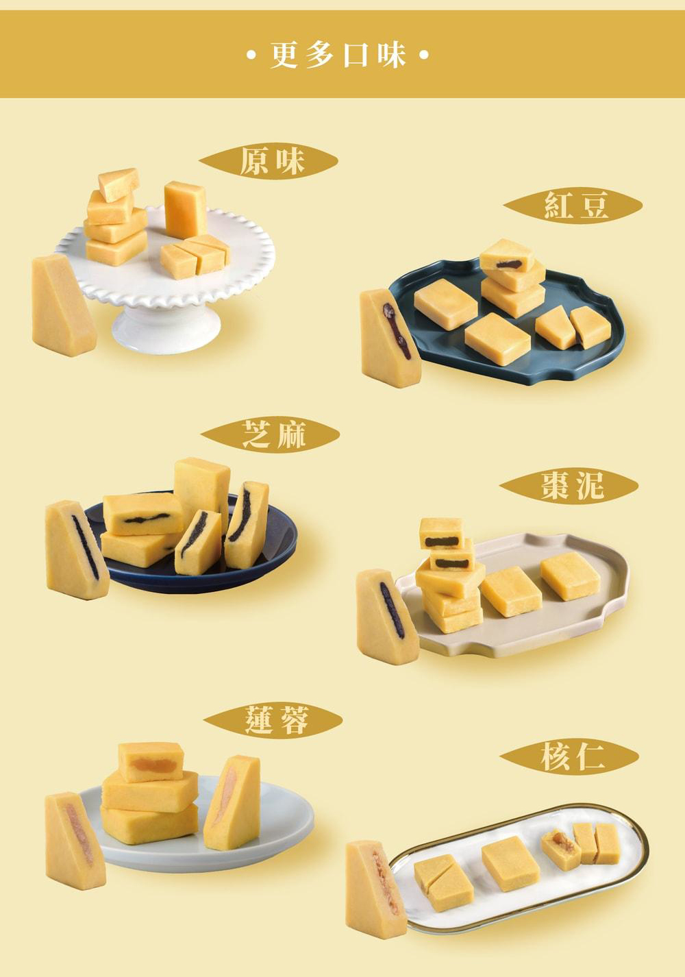 綜合口味:原味x 2, 紅豆x 2, 核仁x 1,芝麻x 2, 棗泥x 2, 蓮蓉x 1