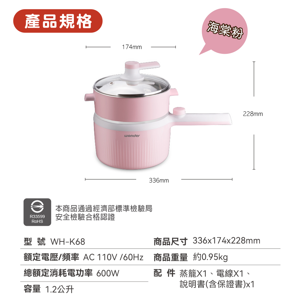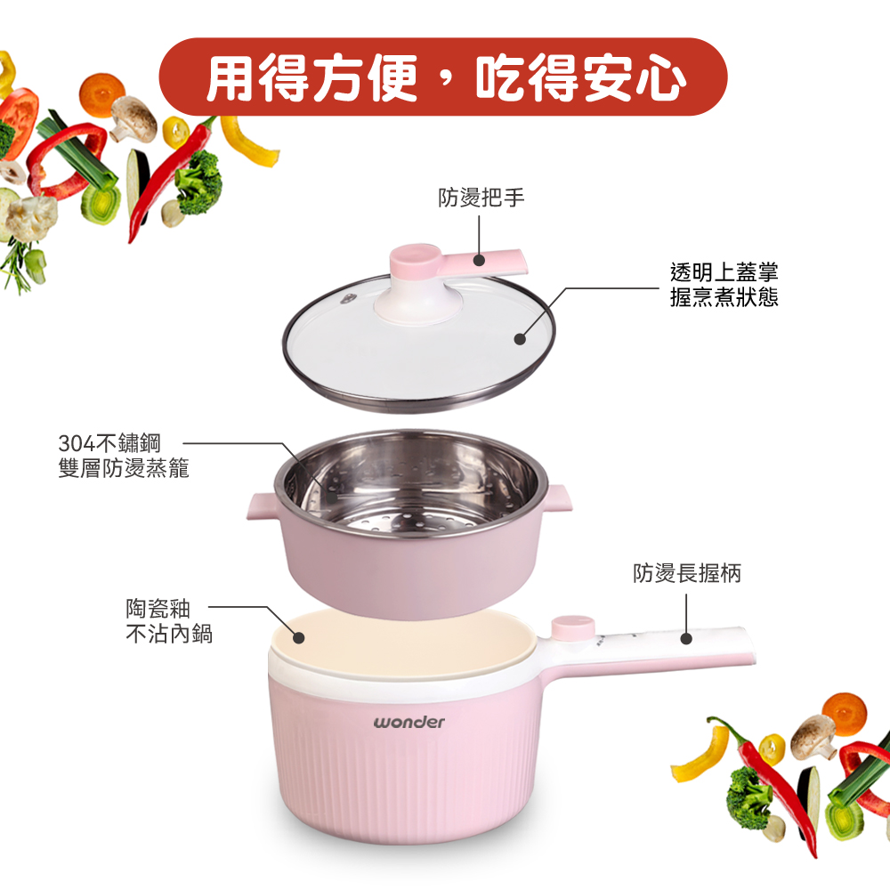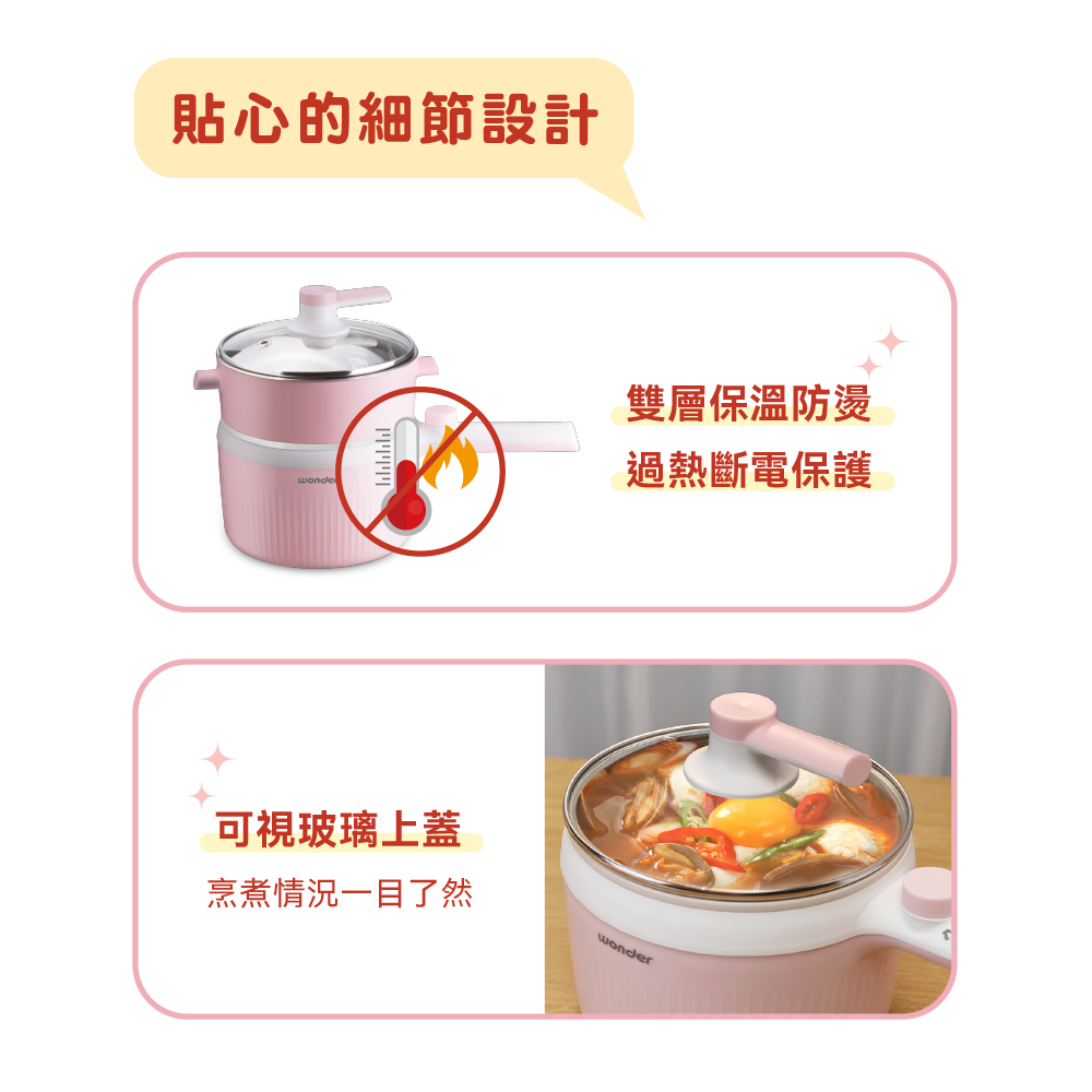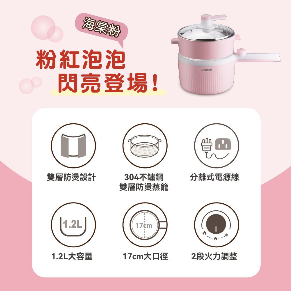 【WONDER】1.2L雙層防燙多功能電蒸煮鍋(WH-K68) 二色任選